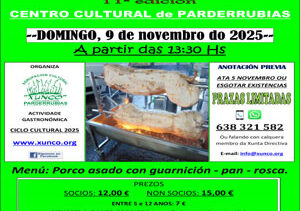 PORCO ASADO NO ESPETO VIRADO Á RODA EN PARDERRUBIAS — 14 octubre, 2025 DOMINGO 9 de NOVEMBRO Read more